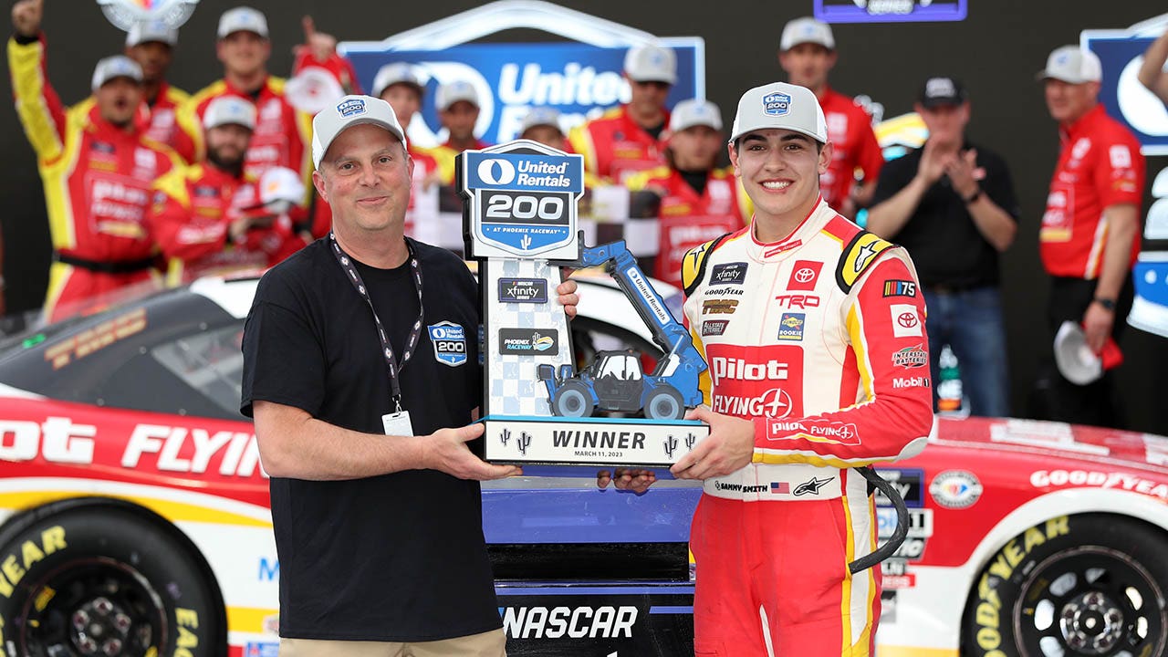 Sammy Smith, driver of the #18 Pilot Flying J Toyota, is presented the United Rentals 200 trophy in victory lane after winning the NASCAR Xfinity Series United Rentals 200 at Phoenix Raceway on March 11, 2023 in Avondale, Arizona. (Meg Oliphant/Getty Images)