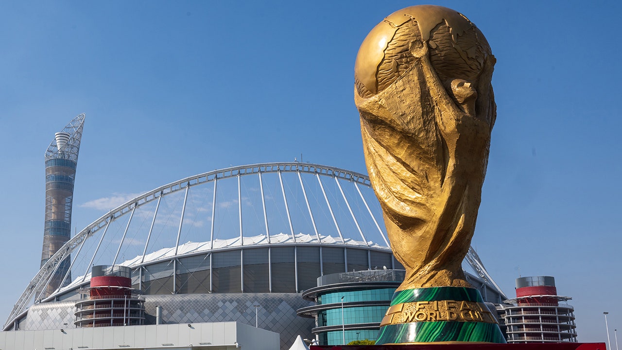 An oversize FIFA World Cup trophy is shown in front of Khalifa International Stadium in Al Rayyan, Qatar. (Peter Kneffel/picture alliance via Getty Images)