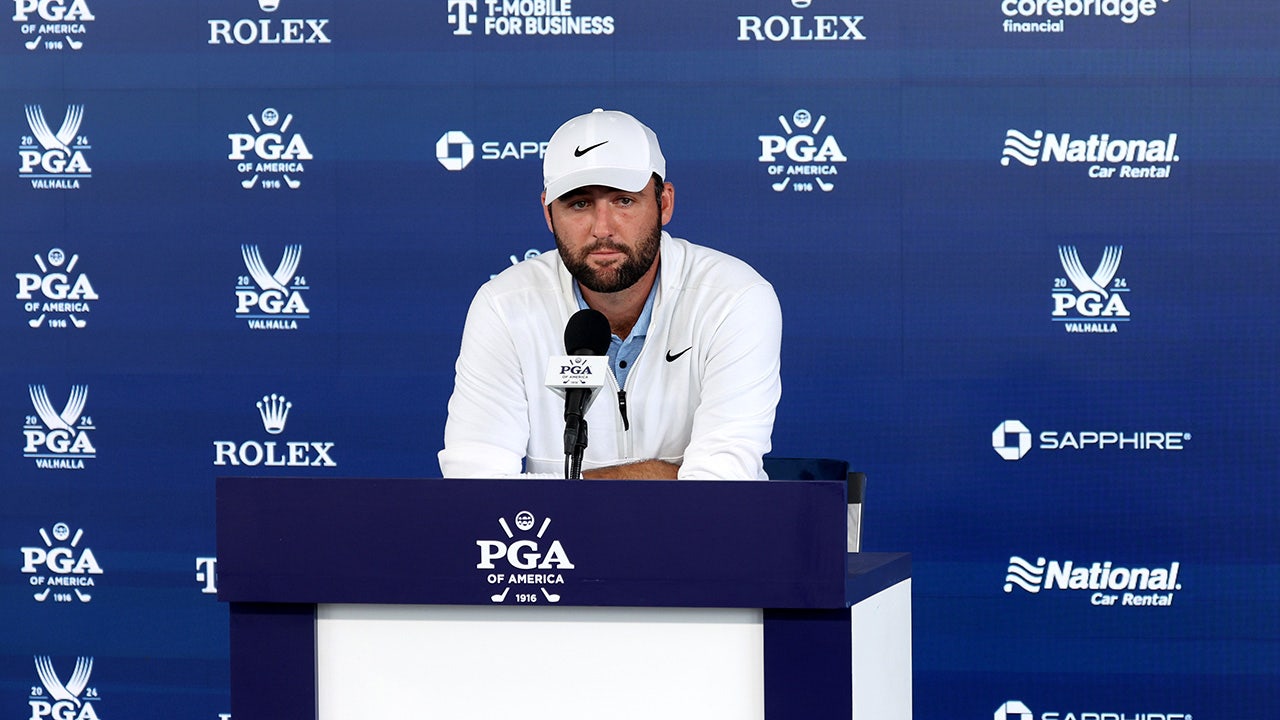 Scottie Scheffler of the United States speaks to the media during a press conference during the second round of the 2024 PGA Championship at Valhalla Golf Club on May 17, 2024, in Louisville, Kentucky. (Patrick Smith/Getty Images)