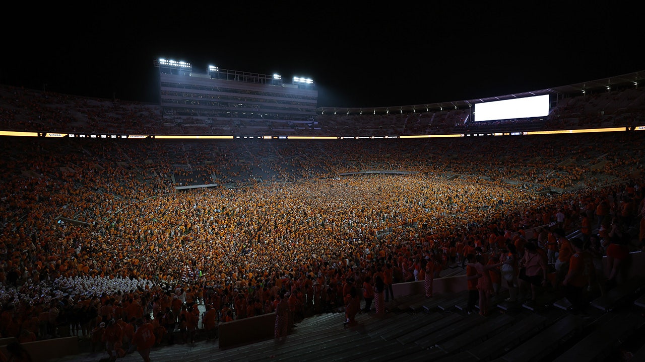 Tennessee Volunteers fans rush the field after defeating the Alabama Crimson Tide at Neyland Stadium n Knoxville, Tennessee, on Oct. 15, 2022. (Donald Page/Getty Images)