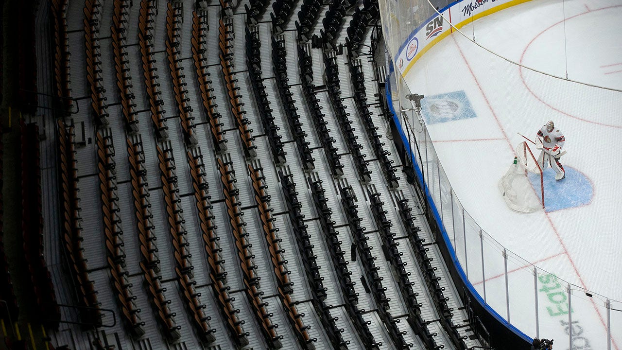 Ottawa Senators goaltender Matt Murray turns to face a bank of empty seats at the Scotiabank Arena during the first period of an NHL hockey game against the Toronto Maple Leafs, in Toronto, Saturday, Jan. 1, 2022. The Ontario Government reduced capacity at sporting events to a maximum of 1000 in a bid to stem the spread of the COVID-19 Omicron variant. (Chris Young/The Canadian Press via AP)