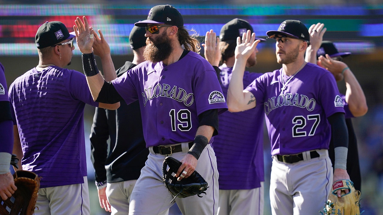 Facing an overworked bullpen, the Dodgers sent All-Star third baseman Justin Turner to the mound in the ninth, the first time he's pitched in his career. He gave up back-to-back singles to Story and Cron before retiring the next three batters and walking off to cheers.