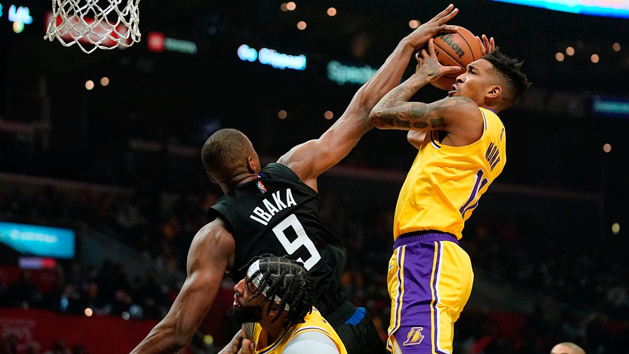 Los Angeles Lakers guard Malik Monk, right, shoots as Los Angeles Clippers center Serge Ibaka, left, defends while forward Anthony Davis stands by during the first half of an NBA basketball game Thursday, Feb. 3, 2022, in Los Angeles. (AP Photo/Mark J. Terrill)
