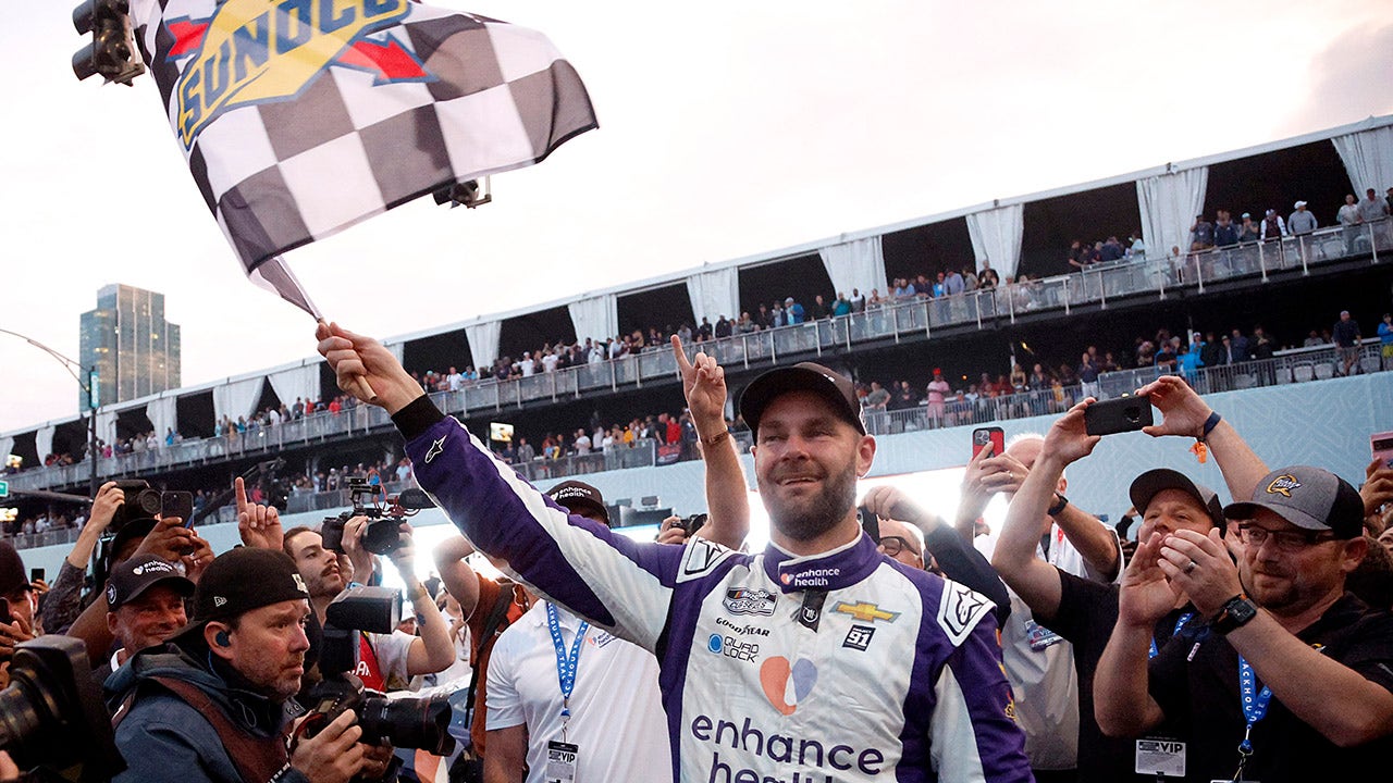 Shane Van Gisbergen, driver of the #91 Enhance Health Chevrolet, celebrates with the checkered flag after winning the NASCAR Cup Series Grant Park 220 at the Chicago Street Course on July 2, 2023 in Chicago. (Sean Gardner/Getty Images)