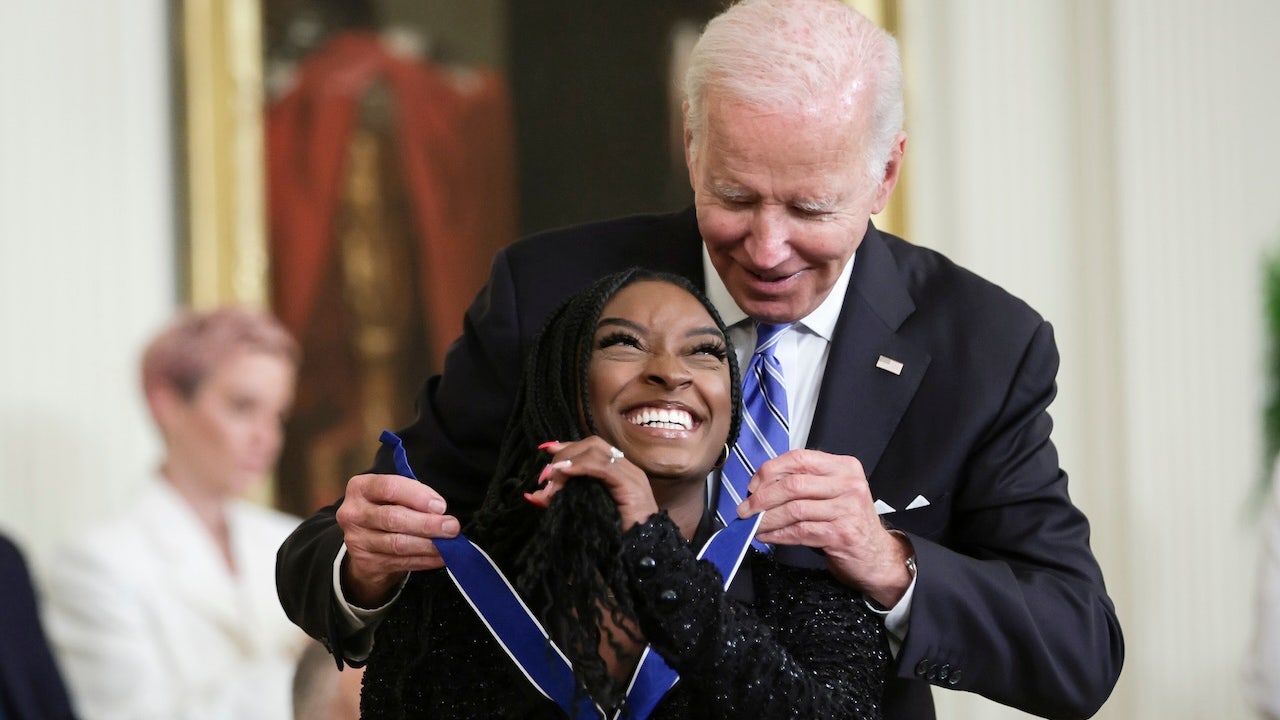 President Biden presents the Presidential Medal of Freedom to Simone Biles during a ceremony in the East Room of the White House, July 7, 2022. (Alex Wong/Getty Images)