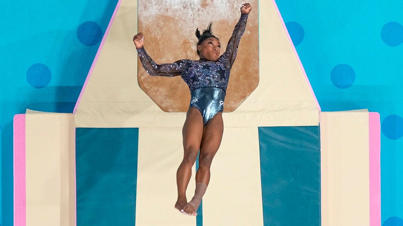 Simone Biles performs on the vault during a women's artistic gymnastics qualification round at the Summer Olympics, Sunday, July 28, 2024, in Paris. (AP Photo/Morry Gash)