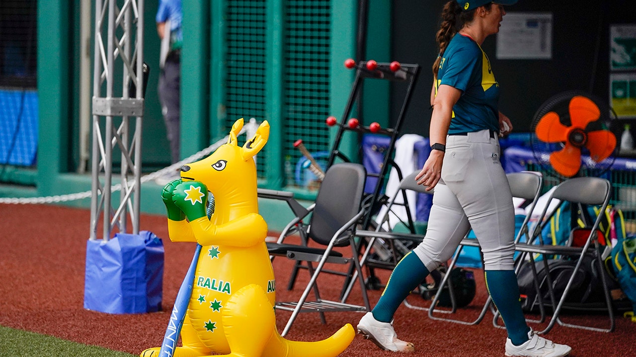 A 3-foot tall yellow inflatable kangaroo with green paws has been a fixture at Australia's softball games. He has a seat in the dugout and even accompanied coach Laing Harrow, pitcher Kaia Parnaby and left fielder Jade Wall to the postgame news conference after Thursday's 1-0 victory over Italy.