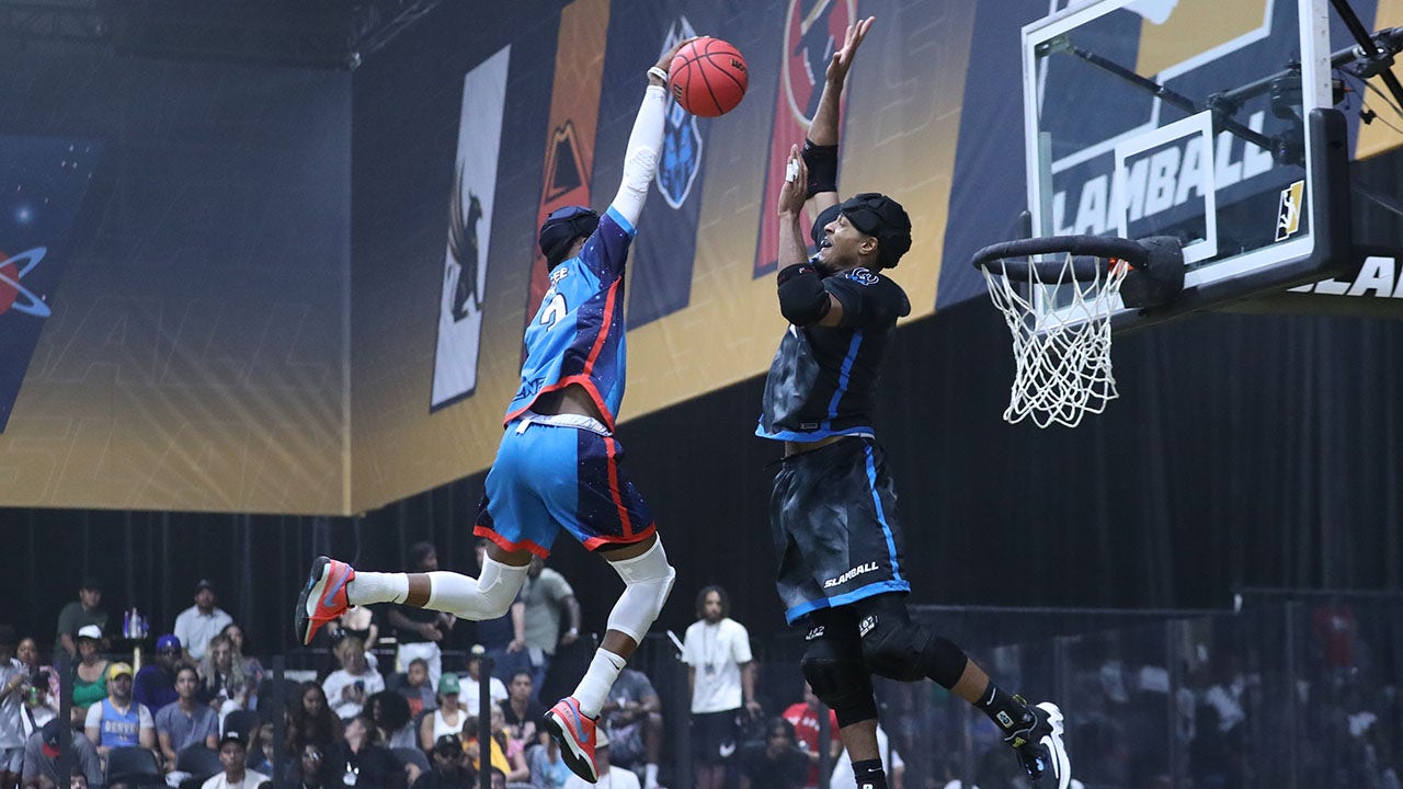 Steven Julian of Wrath blocks Keith McGee of Ozone at the Cox Pavilion on July 22, 2023, in Las Vegas. (Ian Maule/Getty Images for SlamBall)