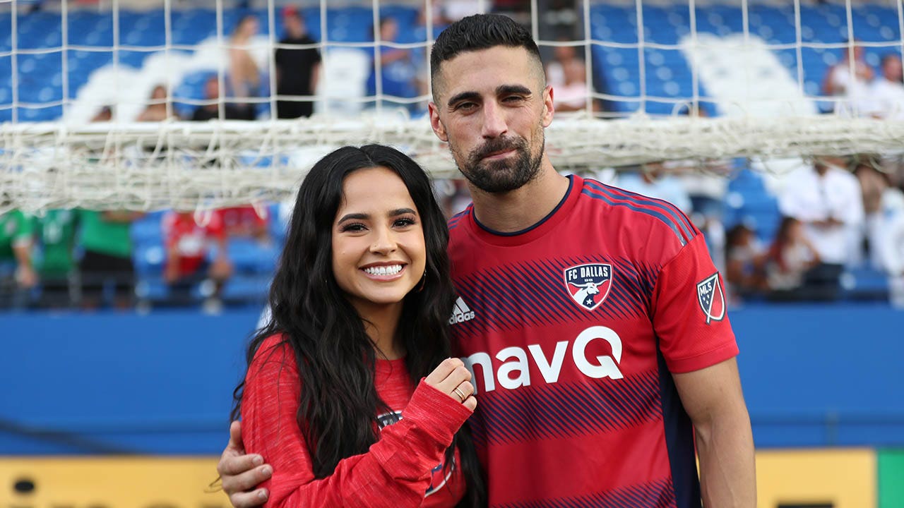 Singer Becky G and her now-fiance Sebastian Lletget #12 of FC Dallas pose for picture after the game between FC Dallas and Sporting Kansas City at Toyota Stadium on October 9, 2022 in Frisco, Texas. (Omar Vega/Getty Images)