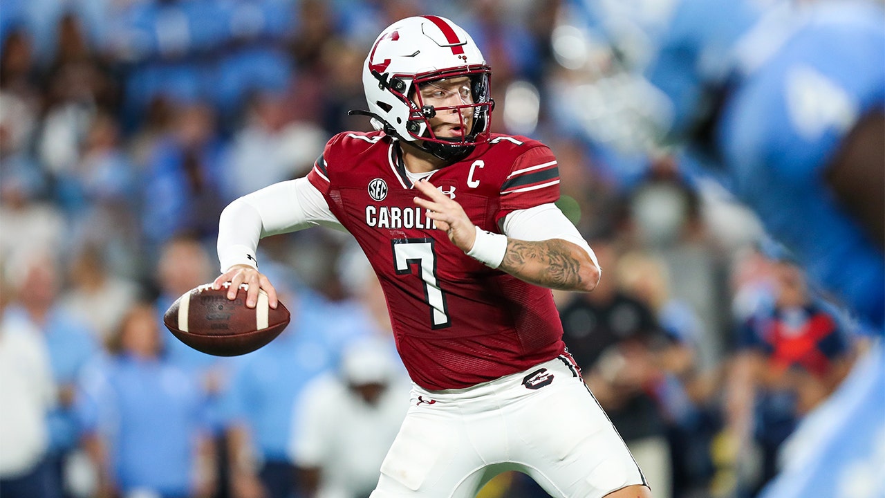 Spencer Rattler of the South Carolina Gamecocks passes the ball against the North Carolina Tar Heels at Bank of America Stadium in Charlotte, North Carolina, on Sept. 2, 2023. (David Jensen/Icon Sportswire via Getty Images)