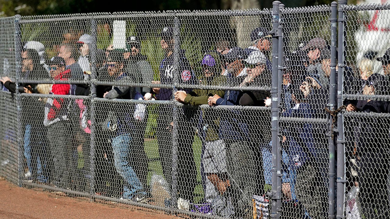 New York Yankees fans watch players practice during spring training baseball, Sunday, March 13, 2022, in Tampa, Fla. (AP Photo/John Raoux)