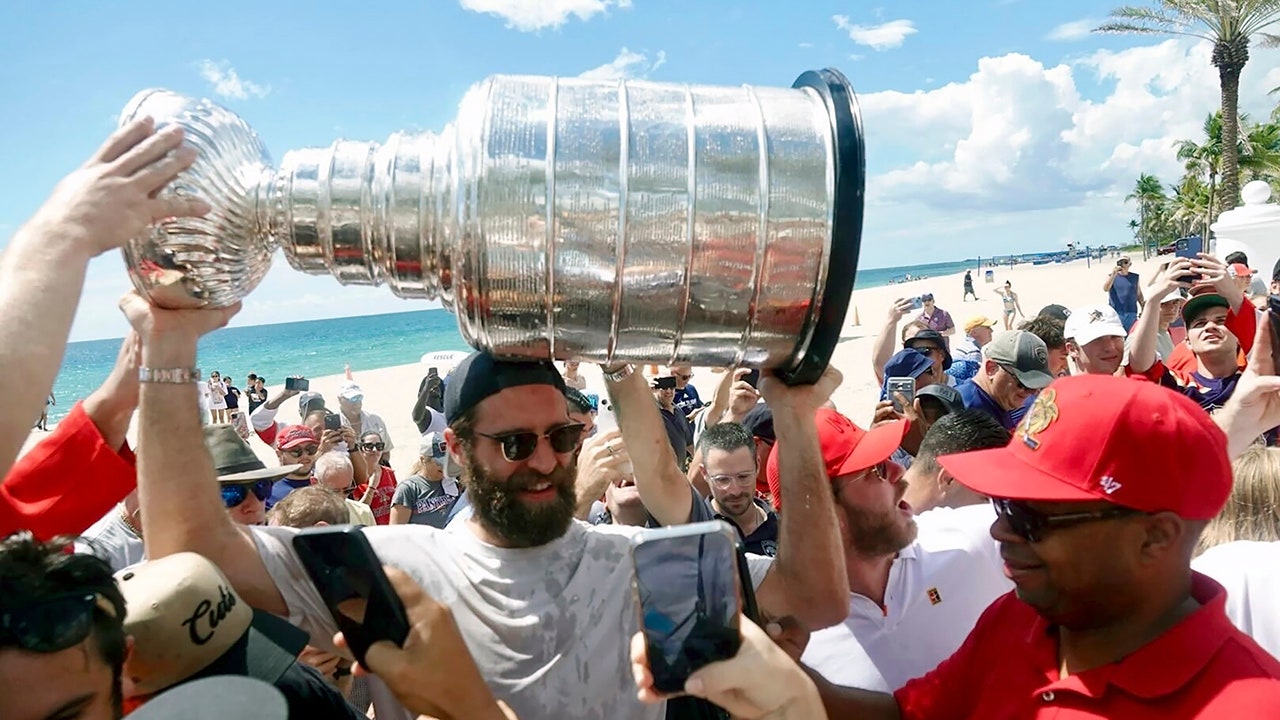 Florida Panthers' Aaron Ekblad carries the Stanley Cup in Fort Lauderdale, Florida, on June 25, 2024. (Joe Cavaretta/South Florida Sun-Sentinel via AP)