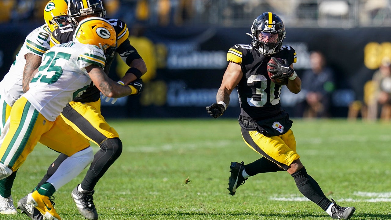 Pittsburgh Steelers' Jaylen Warren runs during the first half of an NFL football game against the Green Bay Packers Sunday, Nov. 12, 2023, in Pittsburgh. (AP Photo/Matt Freed)