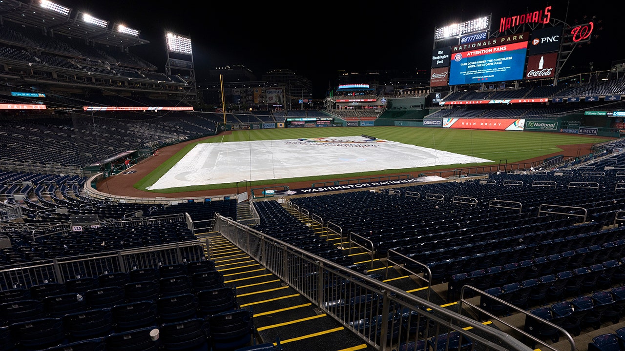 The stormy situation didn’t stop a naked fan from getting onto the field at Nationals Park. The fan went over the centerfield fence and ran toward the tarp covering the dirt in the infield.