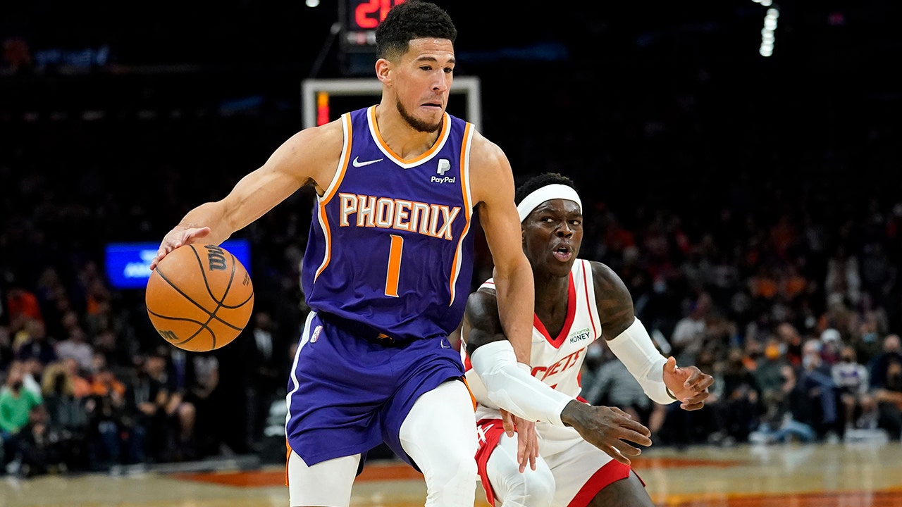 Phoenix Suns guard Devin Booker (1) drives against Houston Rockets guard Dennis Schroder during the second half of an NBA basketball game Wednesday, Feb. 16, 2022, in Phoenix. The Suns won 124-121. (AP Photo/Matt York)