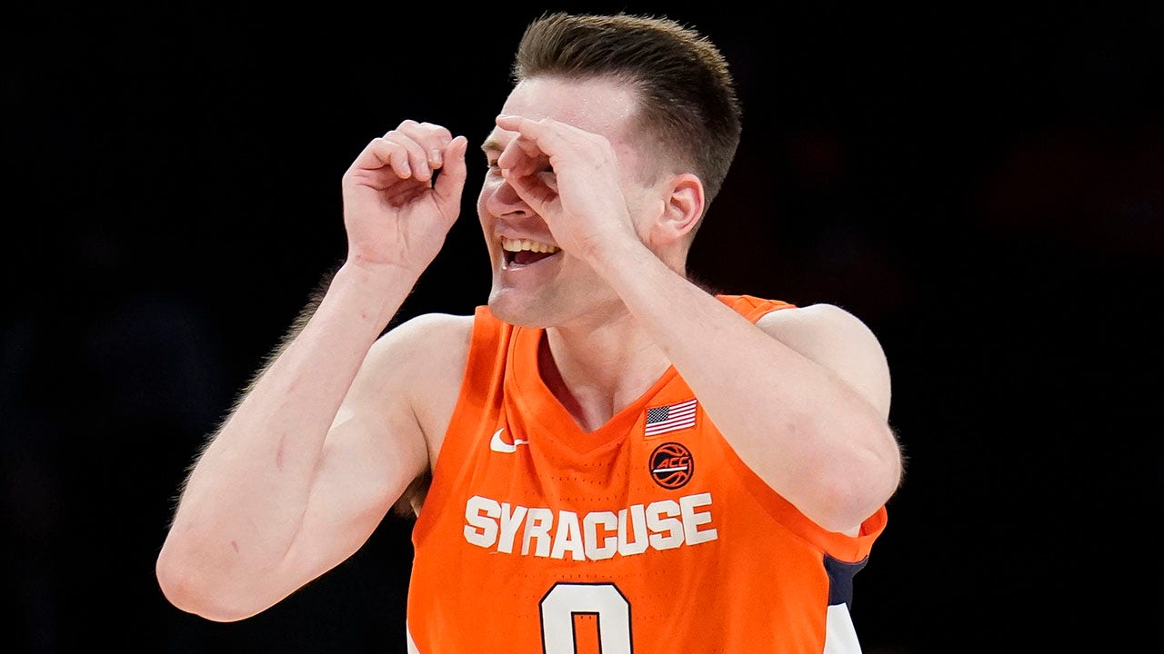 Syracuse's Jimmy Boeheim (0) reacts after scoring in the first half of an NCAA college basketball game against Florida State during the Atlantic Coast Conference men's tournament, Wednesday, March 9, 2022, in New York. (AP Photo/John Minchillo)