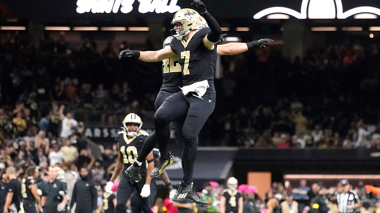 New Orleans Saints' Taysom Hill (7) and Chase Hansen celebrate after Hill recovered a fumble on a Seattle Seahawks fake punt during an NFL football game in New Orleans, Sunday, Oct. 9, 2022. (AP Photo/Gerald Herbert)