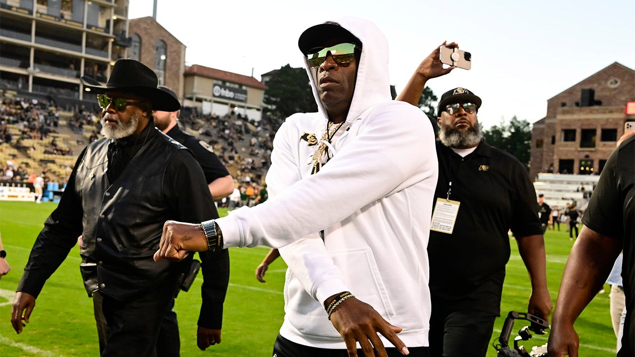 Colorado Buffaloes head coach Deion Sanders takes the field for warmups before the Rocky Mountain Showdown against the Colorado State Rams at Folsom Field, Sept. 16, 2023. (Andy Cross/MediaNews Group/The Denver Post via Getty Images)