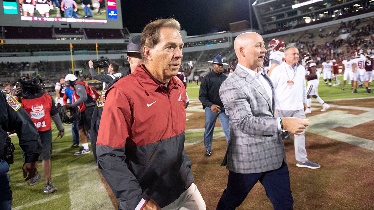 Alabama coach Nick Saban calls to players during a timeout in the first half of an NCAA college football game against Texas A&M on Saturday, Oct. 9, 2021, in College Station, Texas. (AP Photo/Sam Craft) ((AP Photo/Sam Craft))