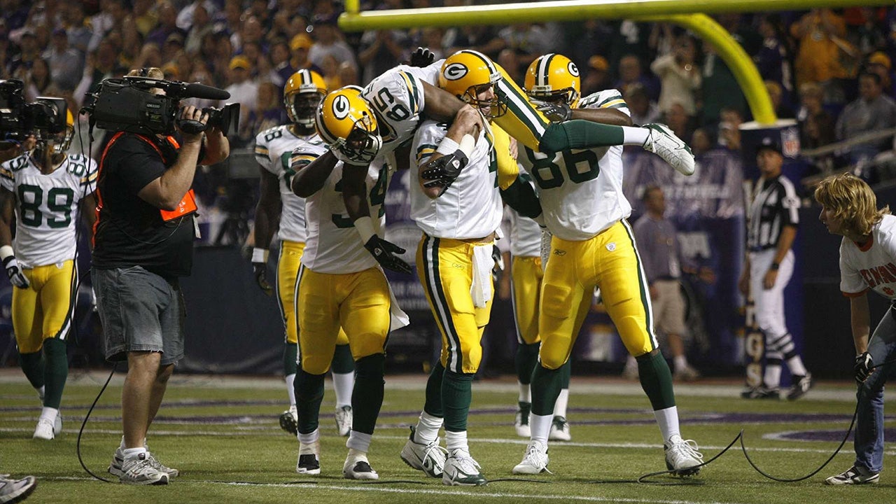 Green Bay Packers QB Brett Favre (4) victorious, lifting Greg Jennings (85) after touchdown and breaking Dan Marino's touchdown pass record during game vs Minnesota Vikings, Minneapolis, MN 9/30/2007. (John Biever/Sports Illustrated via Getty Images)