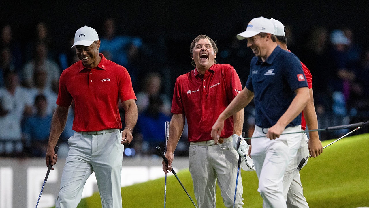 Kevin Kisner, center, laughs after barely missing a putt next to Tiger Woods, left, of Jupiter Links GC and Matt Fitzpatrick of New York Golf Club during a TGL match in SoFi Center at Palm Beach State College on Feb. 18, 2025 in Palm Beach Gardens, Florida. (GREG LOVETT/PALM BEACH POST / USA TODAY NETWORK via Imagn Images)