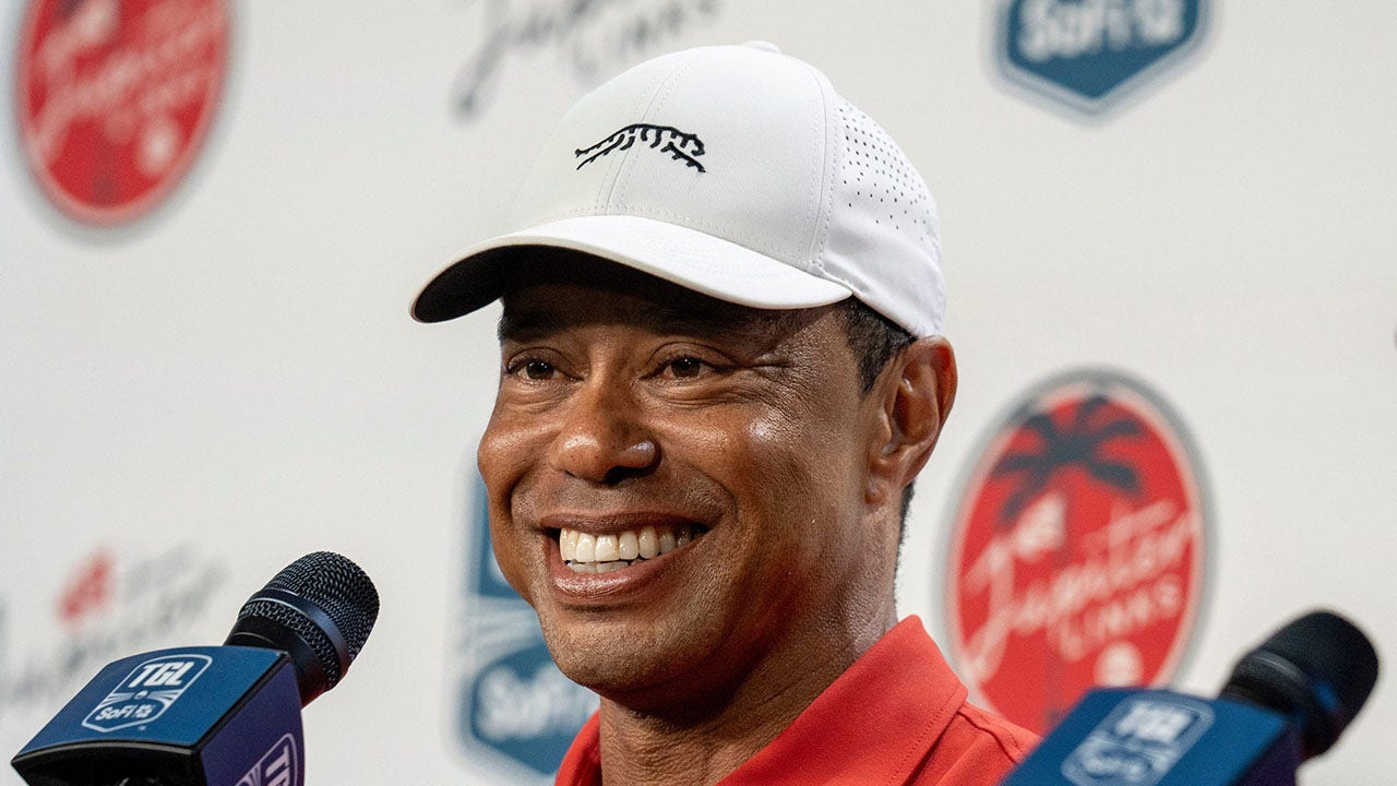 Golfer Tiger Woods smiles during a press conference after playing at SoFi Center in a match between Jupiter Links Golf Club and Los Angeles Golf Club in the TGL. (Imagn)