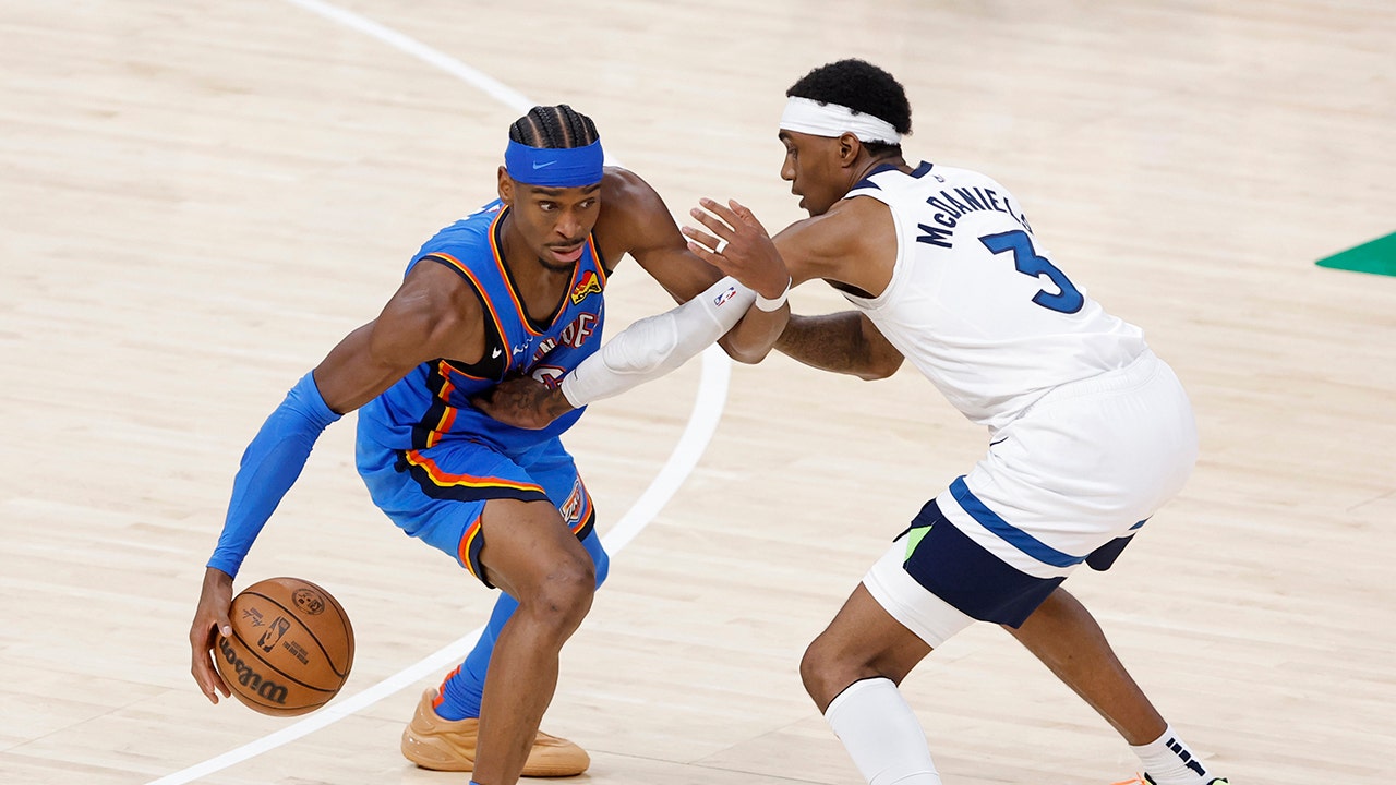 Oklahoma City Thunder guard Shai Gilgeous-Alexander, #2, drives against Minnesota Timberwolves forward Jaden McDaniels, #3, in the fourth quarter during game two of the Western Conference Finals for the 2025 NBA Playoffs at Paycom Center. (Alonzo Adams-Imagn Images)
