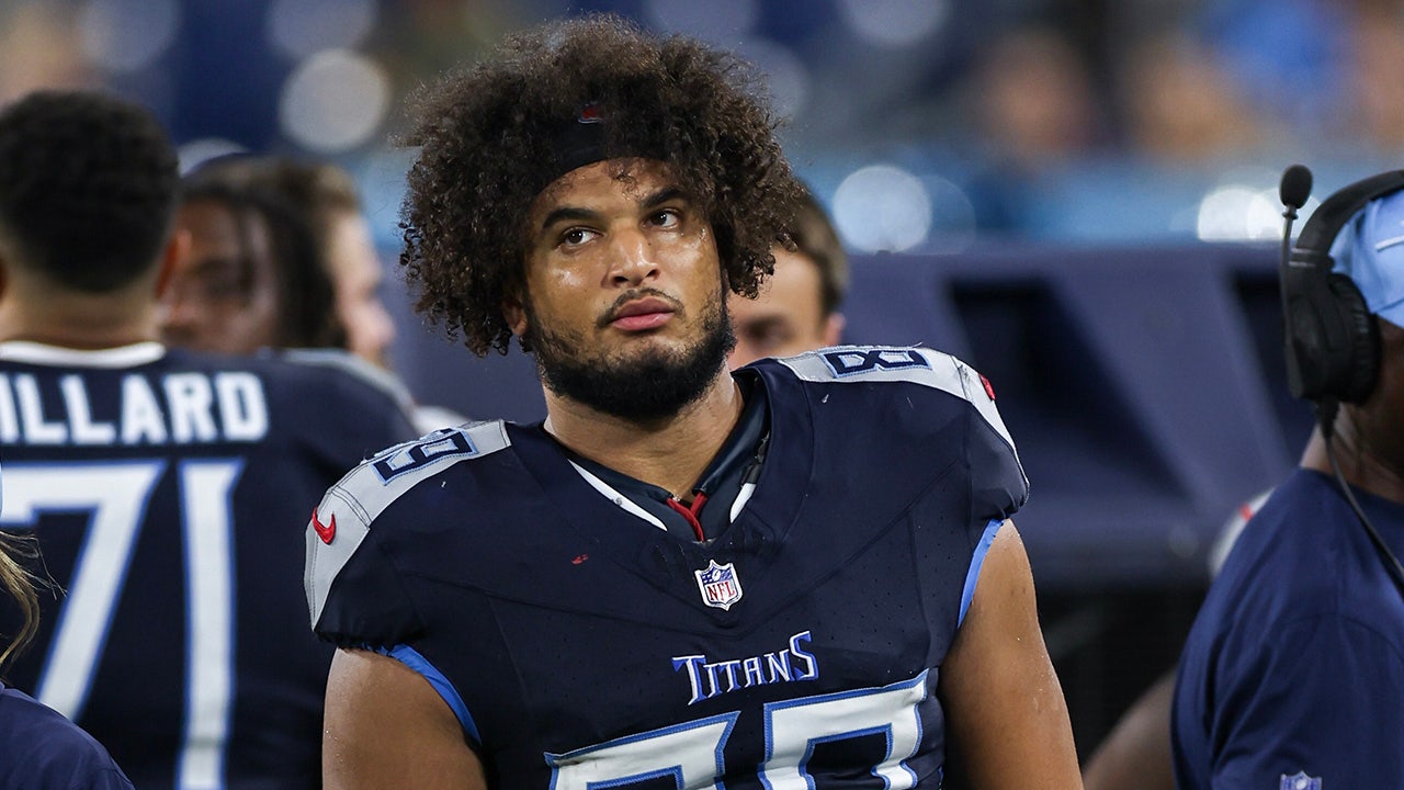 Thomas Odukoya of the Tennessee Titans on the sidelines during the preseason game against the New England Patriots at Nissan Stadium on August 25, 2023, in Nashville, Tennessee. (Silas Walker/Getty Images)