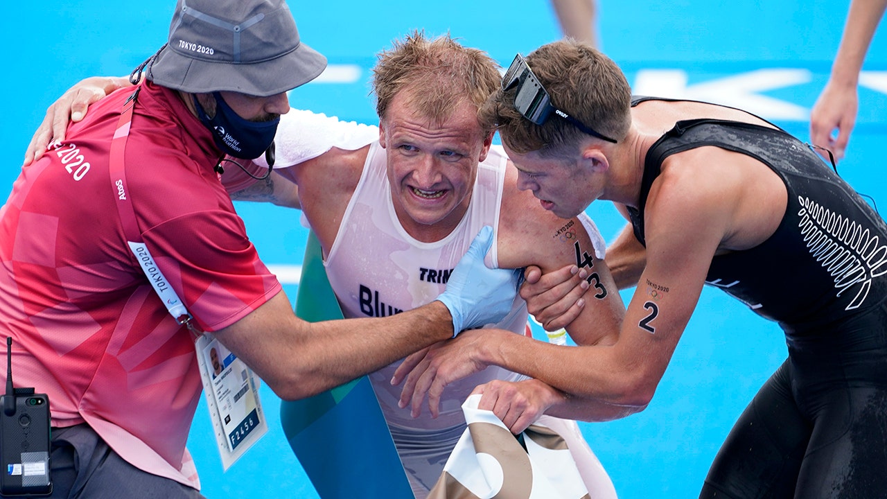 Norway’s Kristian Blummenfelt took home the gold medal in the men’s triathlon event at the Tokyo Olympics on Sunday and showed just how grueling the competition can be.