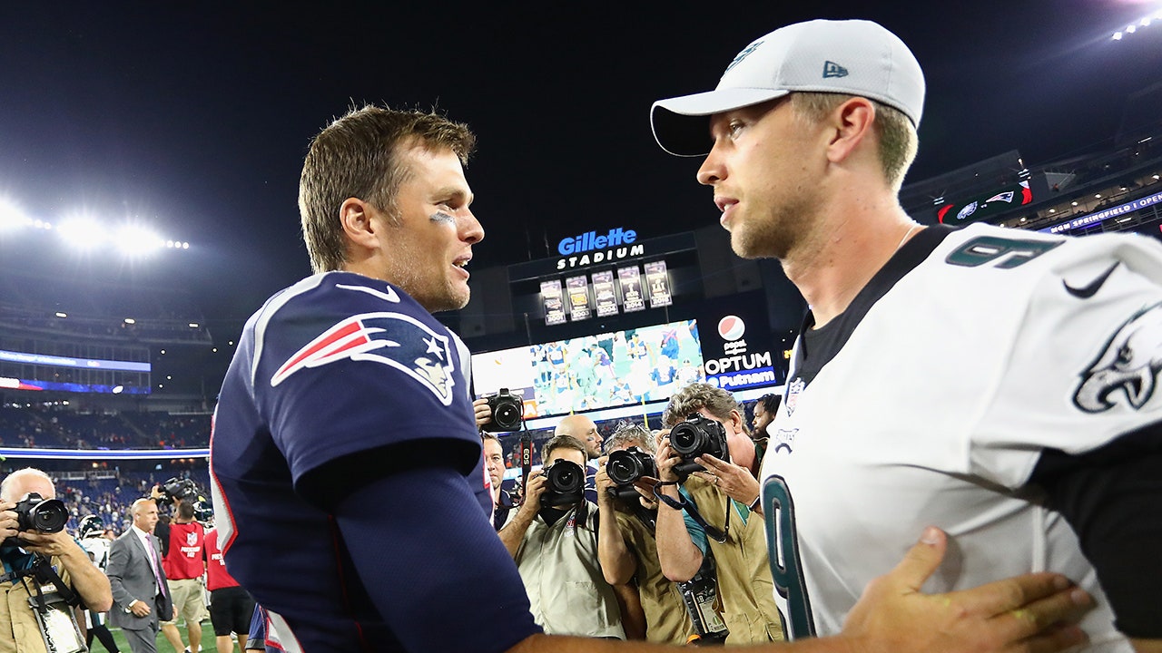 Tom Brady of the New England Patriots talks to Nick Foles of the Philadelphia Eagles after a preseason game at Gillette Stadium on Aug. 16, 2018, in Foxborough, Massachusetts. (Tim Bradbury/Getty Images)
