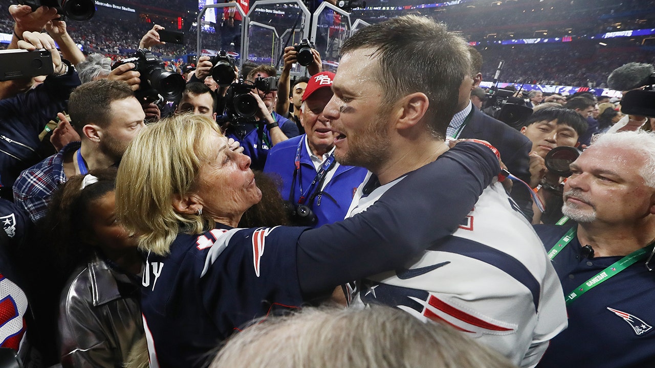 Tom Brady of the New England Patriots hugs his mother Galynn Brady after winning Super Bowl LIII at Mercedes-Benz Stadium on Feb. 3, 2019, in Atlanta. (Jamie Squire/Getty Images)