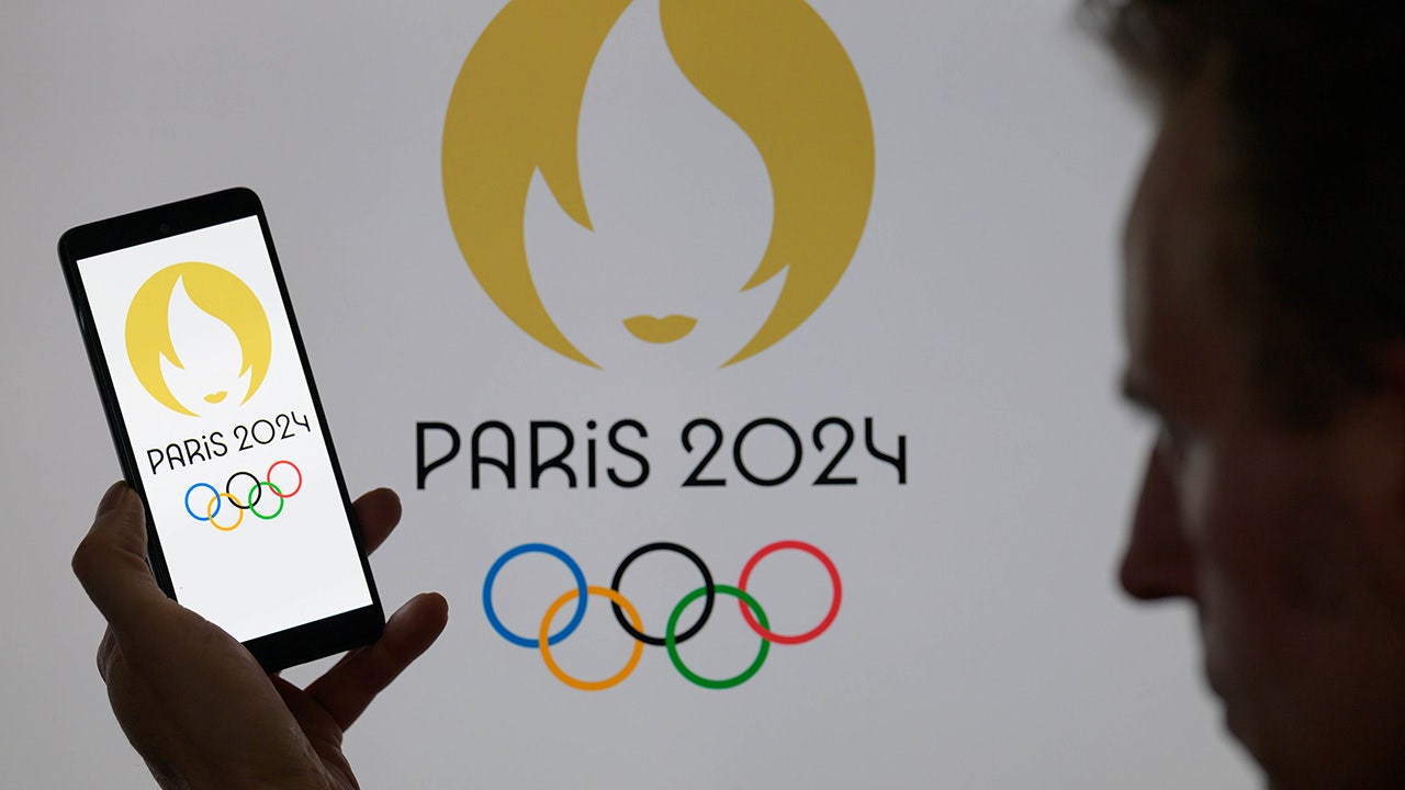 The Paris Olympic Games logo is being displayed on a smartphone with the Paris 2024 Olympic Games icon visible in the background in this photo illustration in Brussels on May 11, 2024. (Jonathan Raa/NurPhoto via Getty Images)