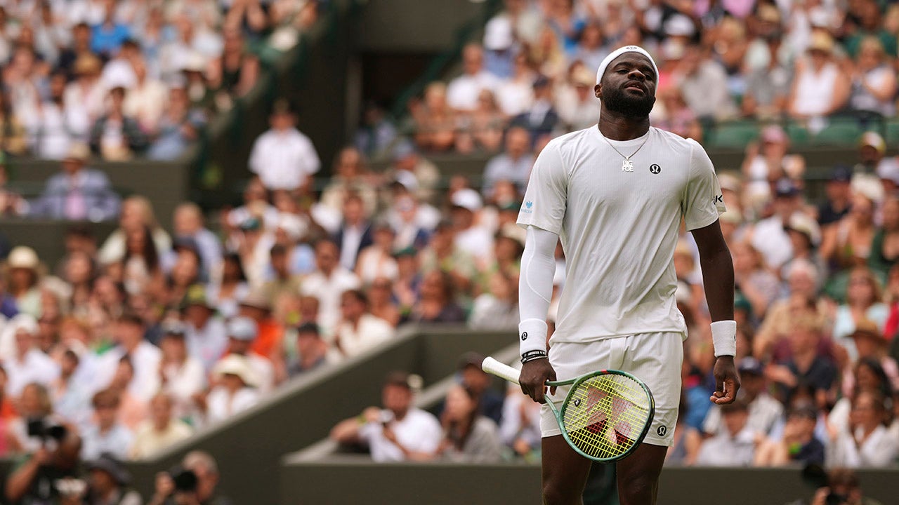 Frances Tiafoe of the U.S. reacts after missing a point as he plays Cameron Norrie of Britain during their second round men's singles match at the Wimbledon Tennis Championships in London, Wednesday, July 2, 2025. (Alastair Grant/AP Photo)