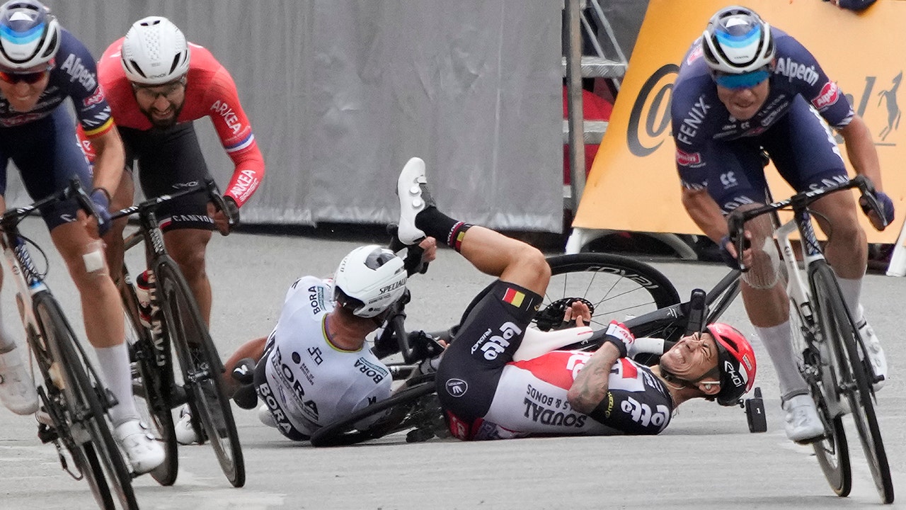 Slovakia's Peter Sagan, center left, crashes with Australia's Caleb Ewan, center right, during the sprint towards the finish line of the third stage of the Tour de France cycling race over 113.65 miles with start in Lorient and finish in Pontivy, France, Monday, June 28, 2021. (AP Photo/Christophe Ena, Pool)