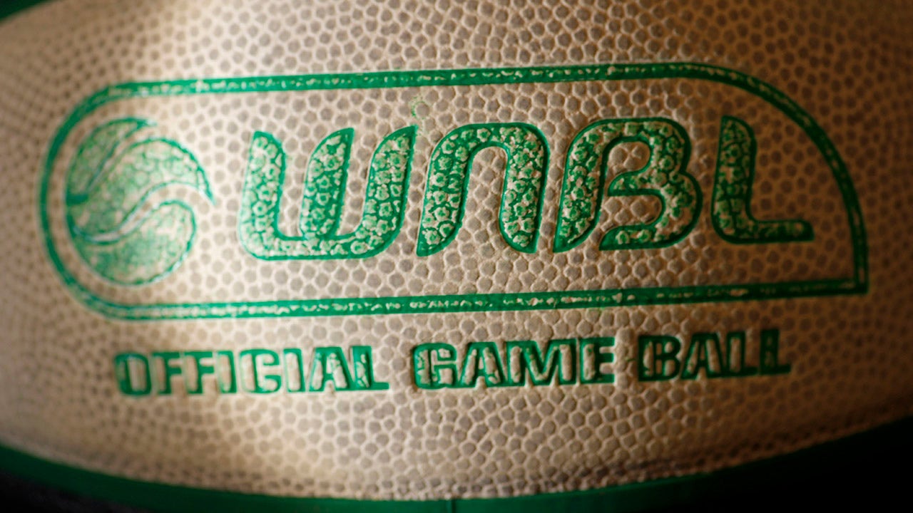 The WNBL logo is featured on a ball during the round 15 WNBL match between the UC Capitals and Sydney Uni Flames at the National Convention Centre on Jan. 26, 2020 in Canberra, Australia. (Brent Lewin/Getty Images)