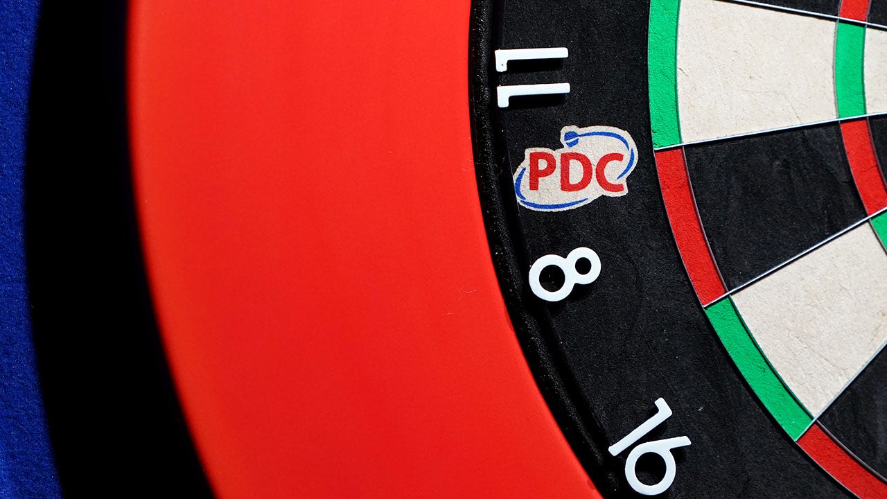 A general view of a dart board featuring the PDC logo during the final on day three of the Ladbrokes Masters 2021 tournament at the Marshall Arena, Milton Keynes. (Zac Goodwin/PA Images via Getty Images)