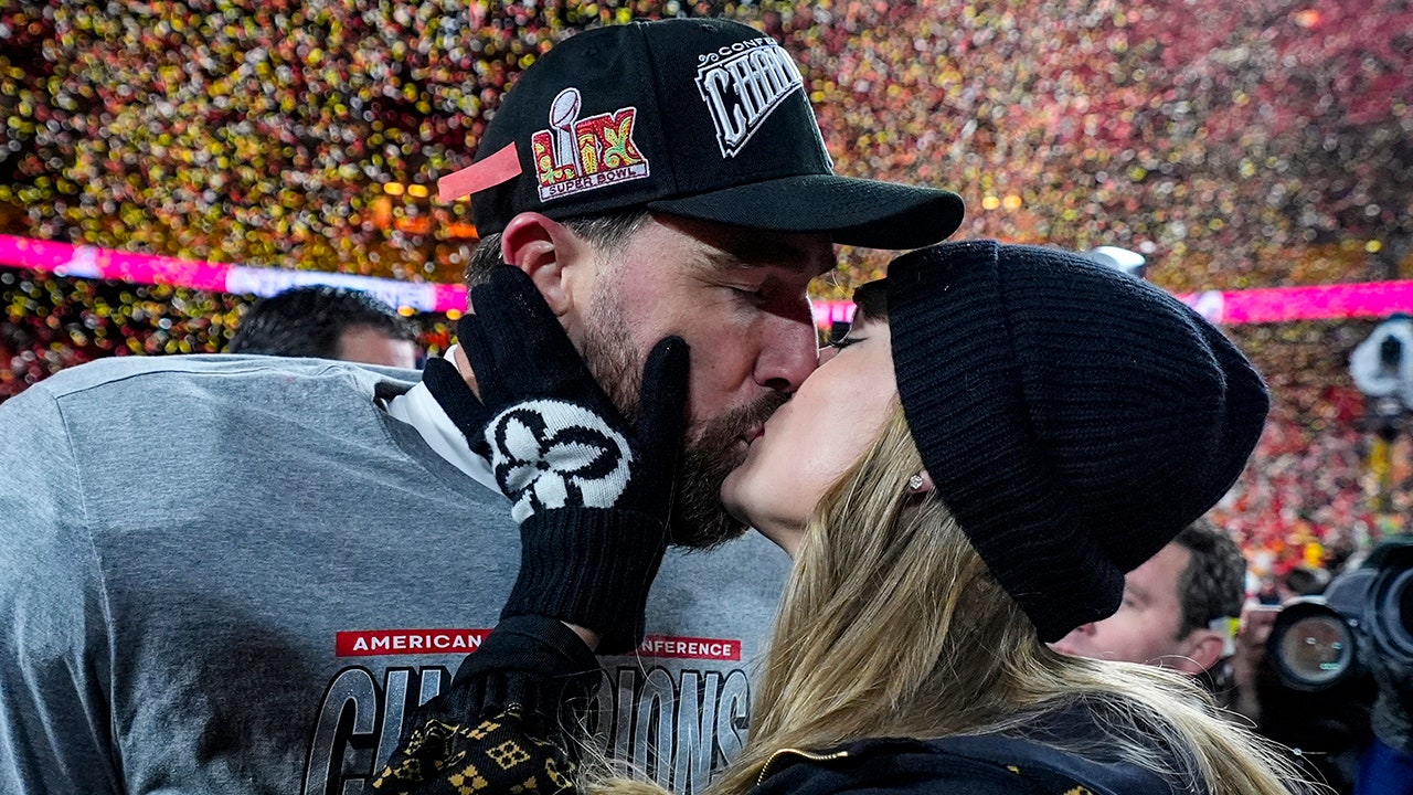 Kansas City Chiefs tight end Travis Kelce and Taylor Swift kiss after the AFC Championship NFL football game against the Buffalo Bills on Sunday, Jan. 26, 2025 in Kansas City, Missouri. (AP Photo/Ashley Landis)