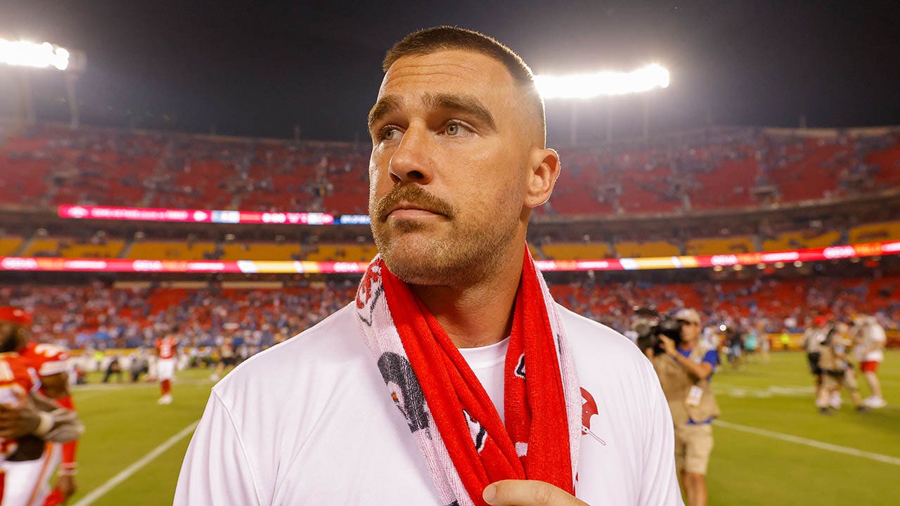 Travis Kelce of the Kansas City Chiefs reacts prior to an NFL preseason game against the Arizona Cardinals at State Farm Stadium Aug. 19, 2023, in Glendale, Ariz. (Michael Owens/Getty Images)