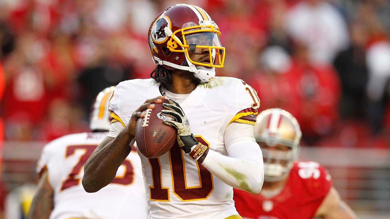 Nov. 23, 2014; Santa Clara, CA: Washington Redskins quarterback Robert Griffin III (10) looks to throw a pass against the San Francisco 49ers in the fourth quarter at Levi's Stadium. (Cary Edmondson-USA Today Sports)
