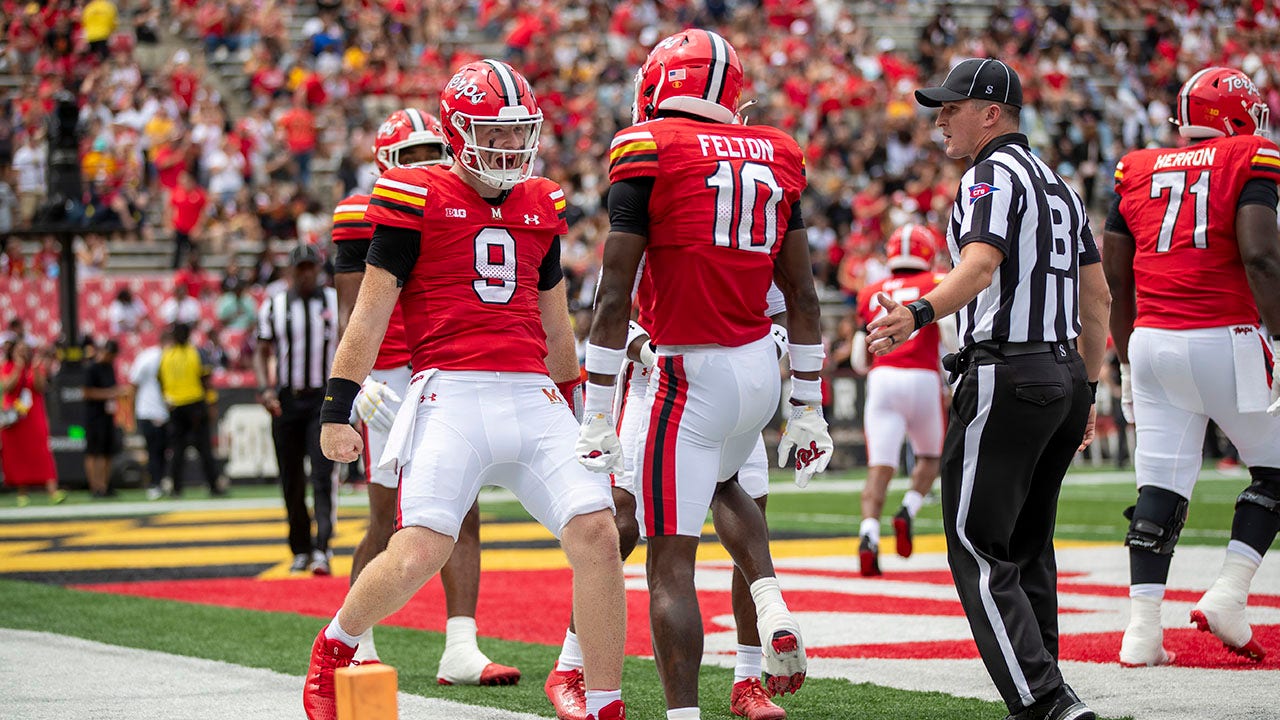 Maryland Terrapins quarterback Billy Edwards Jr. (9) celebrates with Maryland Terrapins wide receiver Tai Felton (10) after a touchdown against the Connecticut Huskies on August 31, 2024, at SECU Stadium in College Park, Maryland. (Charles Brock/Icon Sportswire via Getty Images)