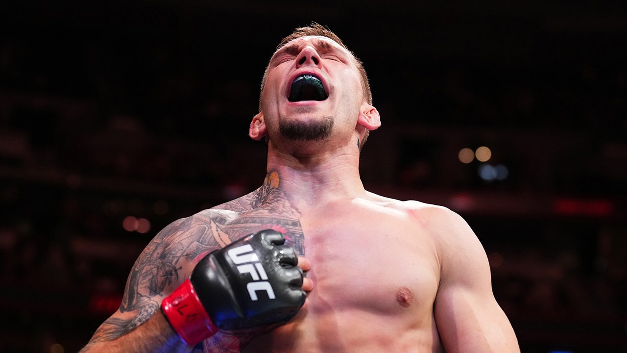 Evan Elder reacts after his victory over Darrius Flowers in a welterweight fight during the UFC Fight Night event at Ball Arena on July 13, 2024, in Denver. (Josh Hedges/Zuffa LLC via Getty Images)