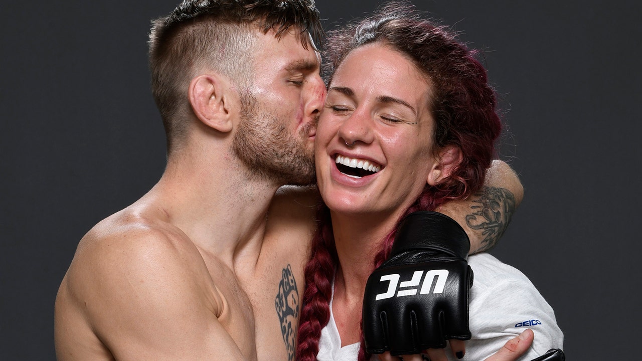 Tim Elliott poses for a portrait with then-girlfriend Gina Mazany after his victory during the UFC Fight Night event inside Flash Forum on UFC Fight Island on July 16, 2020 in Yas Island, Abu Dhabi, United Arab Emirates. (Mike Roach/Zuffa LLC via Getty Images)