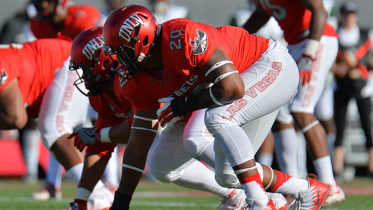 Defensive lineman Jameer Outsey (20) of the UNLV Rebels lines up against the Hawaii Warriors during a game at Sam Boyd Stadium Nov. 4, 2017, in Las Vegas. (Sam Wasson/Getty Images)