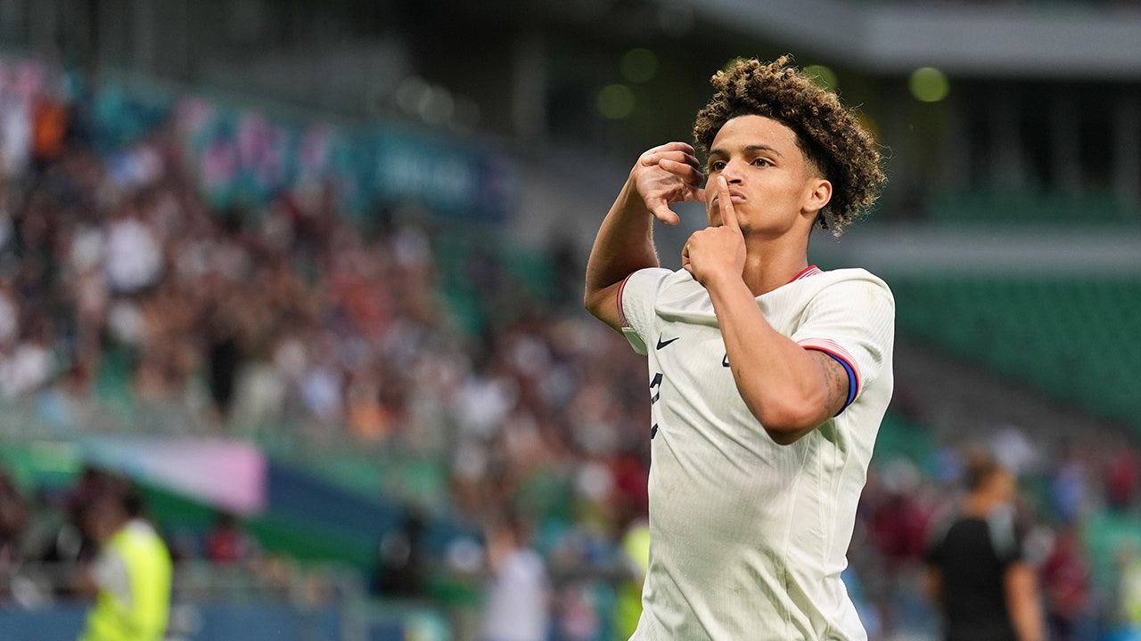 Kevin Paredes celebrates scoring against Guinea during the men's Group A match during the Olympic Games at Stade Geoffroy-Guichard on July 30, 2024, in Saint-Etienne, France. (Andrea Vilchez/ISI/Getty Images)