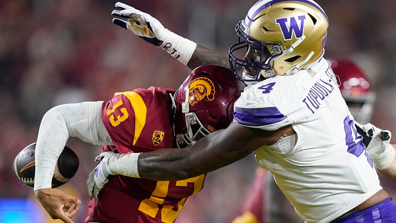 Washington defensive end Zion Tupuola-Fetui forces a fumble by Southern California quarterback Caleb Williams, Saturday, Nov. 4, 2023, in Los Angeles. (AP Photo/Ryan Sun)