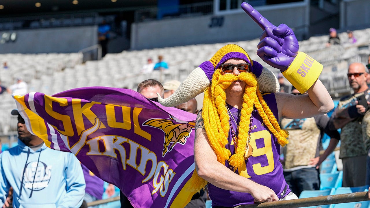 A Minnesota Vikings fan cheers during the second half of an NFL football game between the Carolina Panthers and the Minnesota Vikings, Sunday, Oct. 17, 2021, in Charlotte, N.C. (AP Photo/Jacob Kupferman)