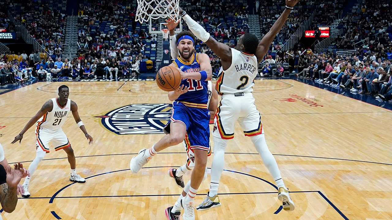 Golden State Warriors guard Klay Thompson (11) goes to the basket against New Orleans Pelicans guard Jared Harper (2) in the second half of an NBA basketball game in New Orleans, Sunday, April 10, 2022. The Warriors won 128-107. (AP Photo/Gerald Herbert)