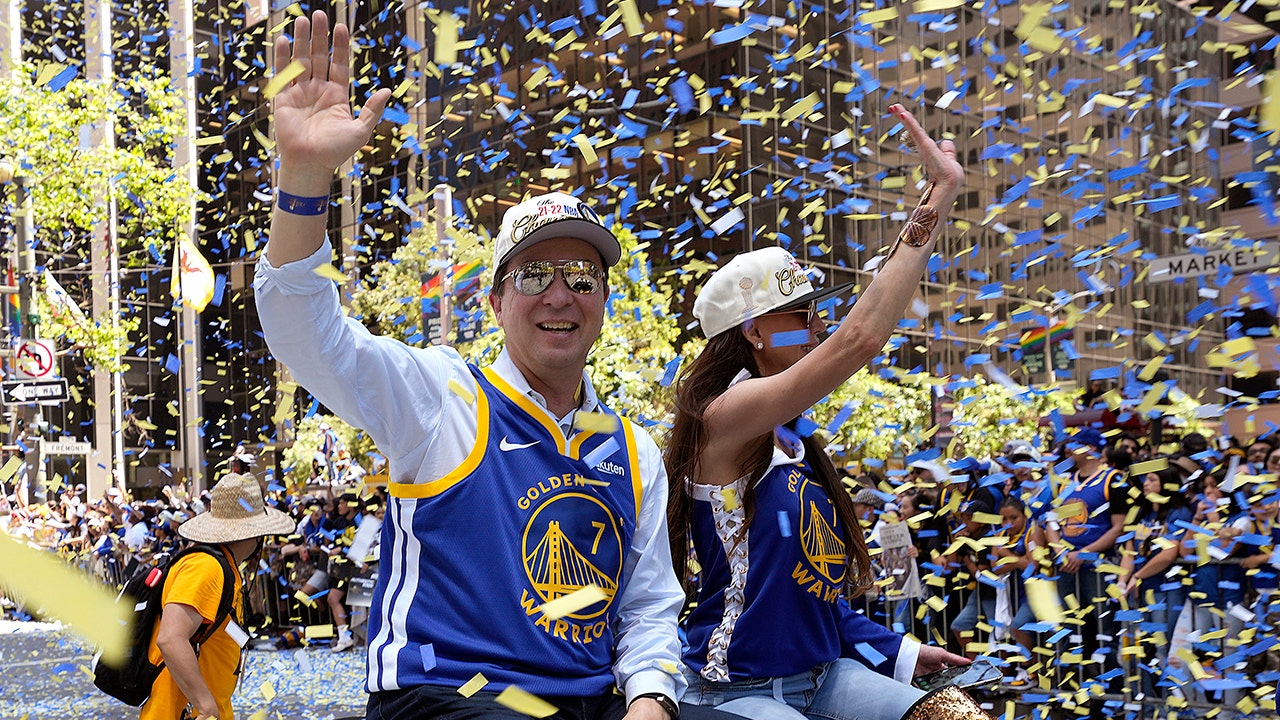 Golden State Warriors' owner Joe Lacob waves to fans during the Golden State Warriors Victory Parade on June 20, 2022 in San Francisco, California. The Golden State Warriors beat the Boston Celtics 4-2 to win the 2022 NBA Finals. (Thearon W. Henderson/Getty Images))