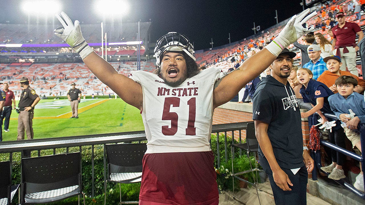 New Mexico State offensive lineman AJ Vaipulu celebrates after defeating Auburn at Jordan-Hare Stadium, November 18, 2023, in Auburn, Alabama. (Michael Chang/Getty Images)