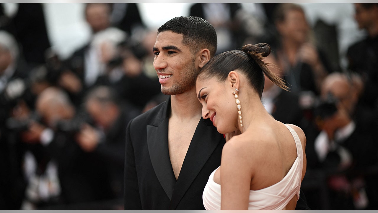 Moroccan defender Achraf Hakimi (L) and his wife Hiba Abouk arrive for the screening of the film "The Innocent (L'Innocent)" during the 75th edition of the Cannes Film Festival in Cannes, southern France, on May 24, 2022. (LOIC VENANCE/AFP via Getty Images)